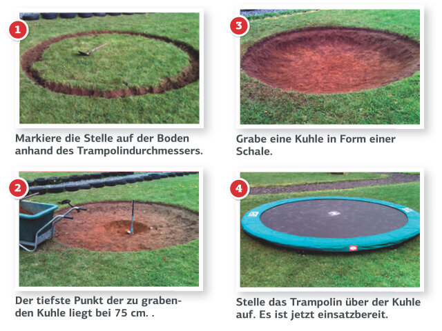 Die Lieferung des Berg Ingrounds beinhaltet alle Teile wie z.B. Erdanker und Rahmennetz für den sicheren Erdeinbau. Das Berg Inground bietet eine einzigartige, patentierte Lösung für alle, die ihr Trampolin so weit wie möglich außer Sicht platzieren möchten. Denn das Berg InGround Trampolin ist das erste Sprunggerät in Europa, das speziell zum Eingraben entwickelt wurde. So können sie ihr Trampolin ab sofort auf einfachste und sicherste Art und Weise in ihren Garten integrieren. Dieses unauffällige Sprunggerät bereitet ihren Kindern jede Menge Spaß, ohne das Ambiente in ihrem Garten zu beeinträchtigen.